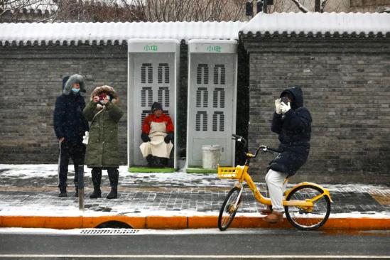 ▲12月13日下午,北京鼓楼旁,一位环卫工在共享充电宝亭子里避雪。当日,北京开始迎来持续强降雪和寒潮天气,气温下降明显,15日至20日出现持续低温天气,最低气温将接近历史同期极值。