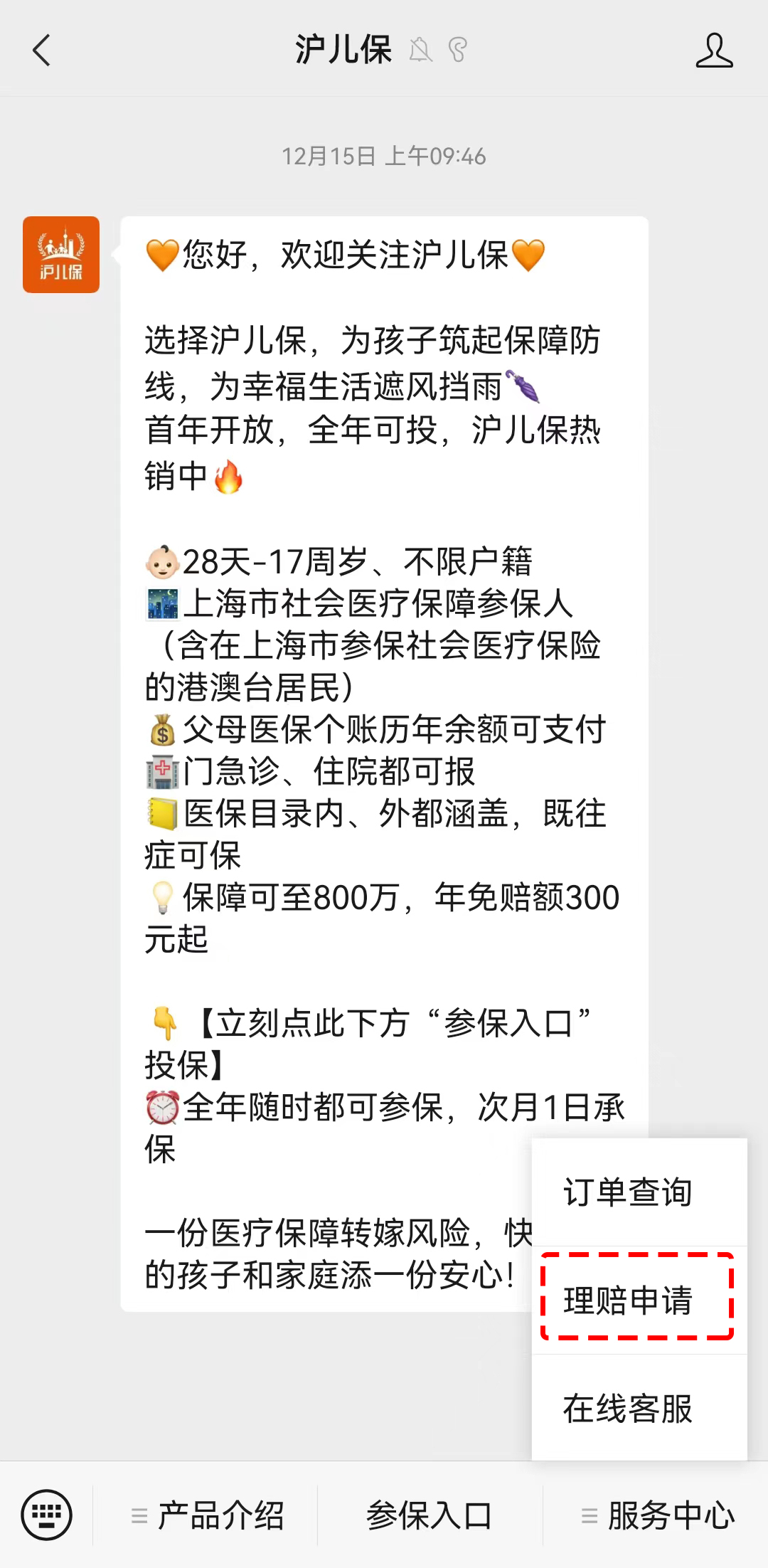 “沪儿保”公众号理赔申请入口: