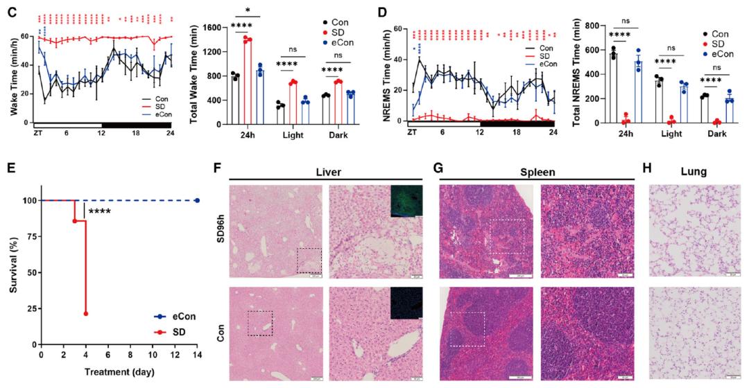 睡眠剥夺情况下多器官受到损伤为了明确长期睡眠剥夺诱导的多器官功能障碍(MODS)早期表型,研究者对“熬夜”48小时的小鼠进行了全面的病理检查。与先前开展的研究一致,研究者在睡眠剥夺小鼠中观察到ROS的积累;正如前文提到的那样,ROS是重要的信号分子和炎症标志物,可能会诱发睡眠不足引起的死亡。