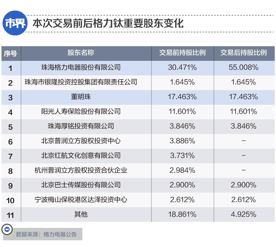 2023年12月19日,格力电器宣布拟进一步收购格力钛24.54%股权,同时还透露,未来12个月里公司将继续增持格力钛合计不超过3.04亿股股份(占格力钛总股本27.53%),届时,格力电器及董明珠将合计持有格力钛100%股权。
