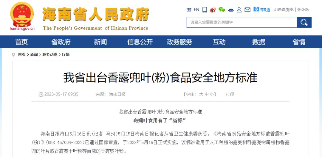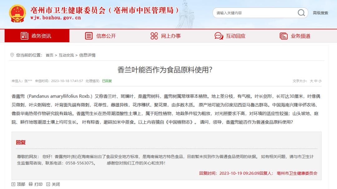 图片来源:赤坎区人民政府官网截图今年10月,安徽省亳州市卫生健康委员会也曾回复网友称:“香露兜叶(粉)在海南省出台了食品安全地方标准,是海南省地方特色食品,目前暂未找到作为普通食品使用的依据。如有相关问题,请与市卫生计生监督局咨询。”
