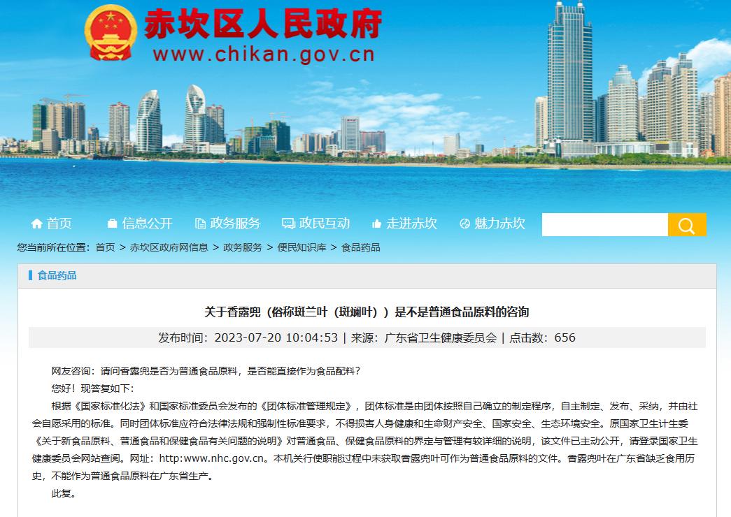 今年7月20日,广东省湛江市赤坎区人民政府官网也曾就此事发布回复称:“本机关行使职能过程中未获取香露兜叶可作为普通食品原料的文件。香露兜叶在广东省缺乏食用历史,不能作为普通食品原料在广东省生产。”