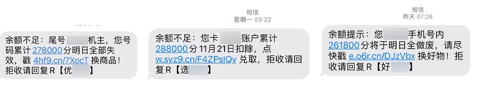 “尾号xxxx机主,您账户内累计278000分将于明日全部清除,请速点击网址兑换商品……”