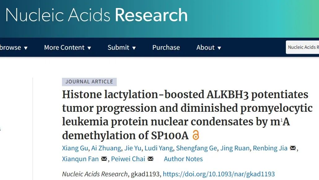 12月20日,上海交通大学柴佩韦、范先群及贾仁兵共同通讯在Nucleic Acids Research 上在线发表题为“Histone lactylation-boosted ALKBH3 potentiates tumor progression and diminished promyelocytic leukemia protein nuclear condensates by m1A demethylation of SP100A”的研究论文,该研究结果表明,ALKBH3依赖性的m1A去甲基化对于PML核体的形成至关重要,从而提供了一种新的治疗策略,其中“靶向m1A重编程策略”对肿瘤治疗是有效的。
