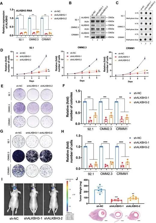 为了探索 ALKBH3 的致癌功能,我们使用两个单独的 shRNA 沉默 ALKBH3 表达(图 2A 和 B)。一致地,在ALKBH3缺陷细胞中观察到m1A水平显著增加(图2C)。此外,ALKBH3沉默导致所有测试的眼部黑色素瘤细胞的细胞生长(图2D)和集落形成能力(图2E和F)显著减弱。此外,敲低ALKBH3导致迁移能力降低,如Transwell测定所证明的那样(图2G和H)。这些数据支持这样一个事实,即 ALKBH3 是眼部黑色素瘤体外恶性增殖和转移的必要致癌因子。为了评估它们在体内的肿瘤形成能力,我们将对照和ALKBH3沉默的92.1黑色素瘤细胞(荧光素酶标记)注射到裸鼠中,并在原位异种移植模型中监测肿瘤生长。生物发光成像显示,ALKBH3缺陷的眼部黑色素瘤细胞的信号强度弱于对照细胞(图2I)。此外,ALKBH3沉默组中异种移植物的平均重量下降了约80%(图2J)。综上所述,这些实验表明,ALKBH3在眼部黑色素瘤的体外和体内肿瘤发生中起致癌作用。