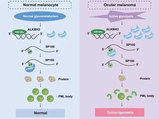 本研究,我们发现组蛋白乳酸化通过去除SP100A的m1A甲基化,增强ALKBH3表达,同时减弱肿瘤抑制性早幼粒细胞白血病蛋白(PML)凝聚物的形成,促进癌症的恶性转化。首先,由于组蛋白乳酸化水平过高,ALKBH3 在高危眼部黑色素瘤中特异性上调,指的是 m1A 低甲基化状态。此外,多组学分析随后确定 PML 小体的核心成分 SP100A 是 ALKBH3 的下游候选靶点。在治疗上,ALKBH3 的沉默在体外和体内均对黑色素瘤表现出有效的治疗效果,这可以通过 SP100A 的耗竭来逆转。从机制上讲,我们发现 YTHDF1 负责识别 m1A 甲基化的 SP100A 转录本,从而提高其 RNA 稳定性和翻译功效。