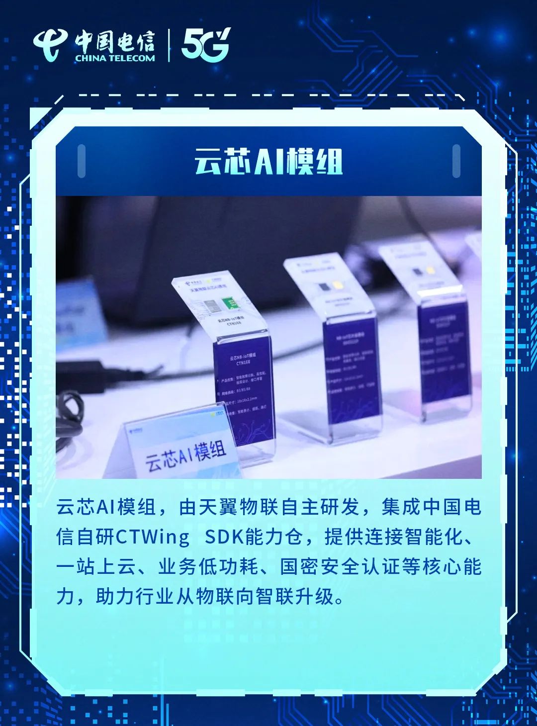 在深圳,南山区基于中国电信物联感知云平台,将存量系统和新建系统统一建设规范,通过5G、AIoT(人工智能物联网)、CIM(城市信息模型)、BIM(建筑信息模型)技术建立了1:1的数字孪生城市,实现了全区各类设备统一接入、统一管理和统一安全保障,让物理城市和数字城市同生共长。08 云芯AI模组
