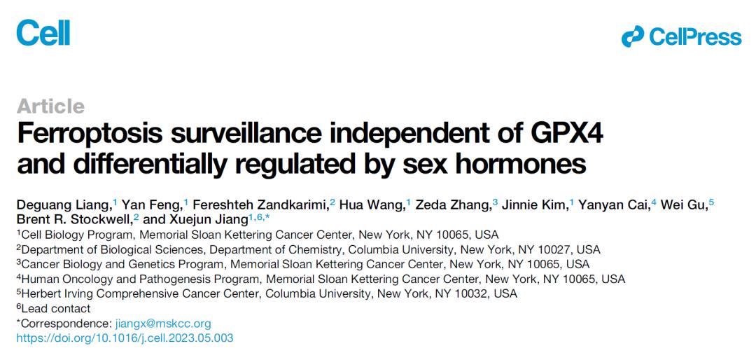 2023年6月1日,纪念斯隆凯特琳癌症中心姜学军教授团队(梁德光博士为第一作者)在 Cell 期刊发表了题为:Ferroptosis surveillance independent of GPX4 and differentially regulated by sex hormones 的研究论文。