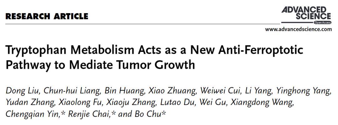 2023年1月11日,山东大学齐鲁医学院初波教授团队联合东南大学柴人杰教授及深圳湾实验室尹成骞教授团队合作,在 Advanced Science 期刊发表了题为:Tryptophan metabolism acts as a new anti-ferroptotic pathway to mediate tumour growth 的研究论文。