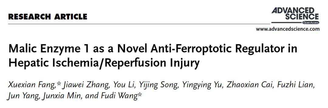 2023年2月25日,浙江大学医学院王福俤教授、杭州师范大学方学贤副教授等人在 Advanced Science 期刊发表了题为:Malic Enzyme 1 as a Novel Anti-Ferroptotic Regulator in Hepatic Ischemia/Reperfusion Injury 的研究论文。