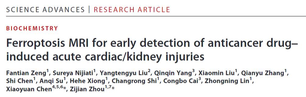 2023年3月8日,厦门大学周子健研究员团队联合新加坡国立大学陈小元教授,在 Science Advances 期刊发表了题为:Ferroptosis MRI for Early Detection of Anticancer Drug-Induced Acute Cardiac/Kidney Injuries 的研究论文。