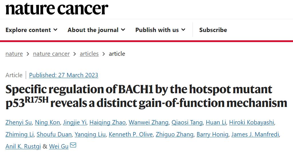 2023年3月27日,哥伦比亚大学顾伟教授团队(苏振毅博士为第一作者)在 Nature Cancer 期刊发表了题为:Specific regulation of BACH1 by the hotspot mutant p53R175H reveals a distinct gain-of-function mechanism 的研究论文。