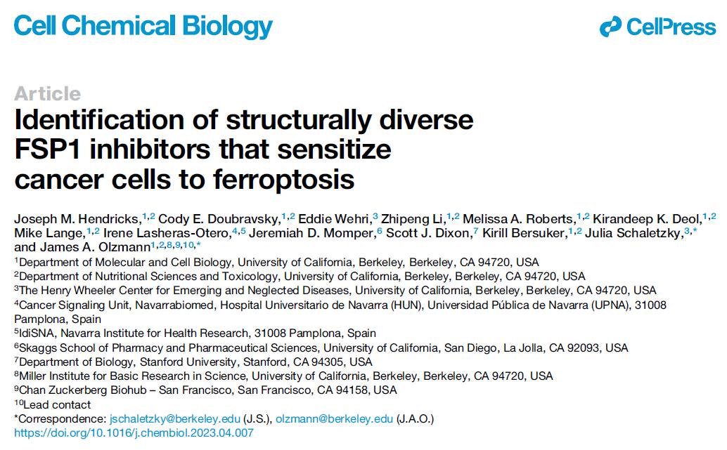 2023年5月12日,加州大学伯克利分校的研究人员在 Cell Chemical Biology 上发表了题为:Identification of structurally diverse FSP1 inhibitors that sensitize cancer cells to ferroptosis 的研究论文。