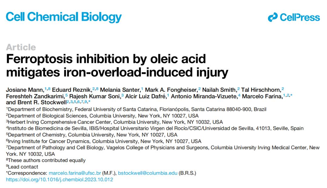 2023年11月8日,“铁死亡之父“ Brent Stockwell 在 Cell 子刊 Cell Chemical Biology 上发表了题为:Ferroptosis inhibition by oleic acid mitigates iron-overload-induced injury 的研究论文。