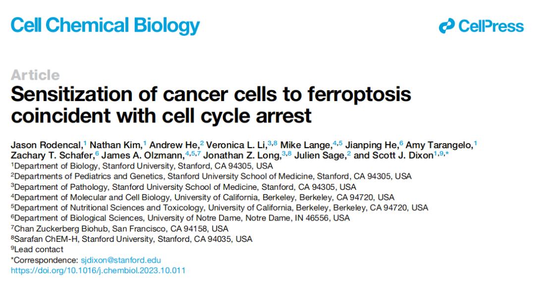 2023年11月13日,斯坦福大学 Scott J. Dixon 团队在 Cell 子刊 Cell Chemical Biology 上发表了题为:Sensitization of cancer cells to ferroptosis coincident with cell cycle arrest 的研究论文。