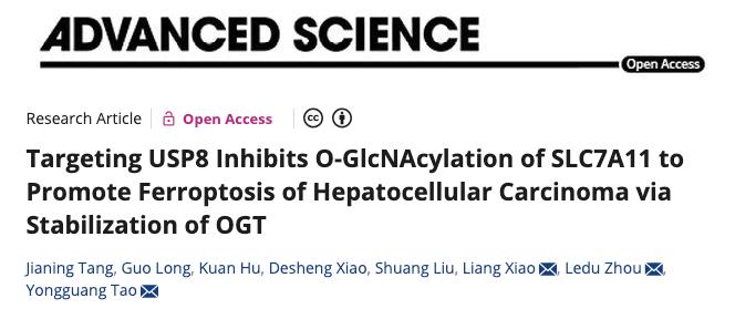 2023年10月23日,中南大学基础医学院陶永光教授团队与湘雅医院周乐杜、肖亮教授肝脏外科团队合作,在 Advanced Science 期刊发表了题为:Targeting USP8 Inhibits O-GlcNAcylation of SLC7A11 to Promote Ferroptosis of Hepatocellular Carcinoma via Stabilization of OGT 的研究论文。