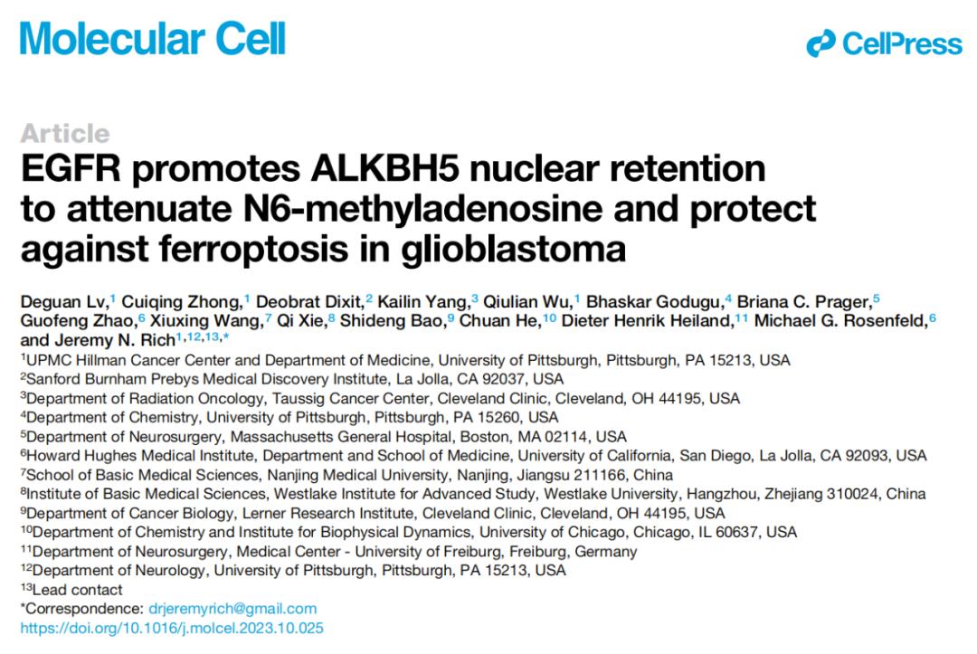 2023年11月17日,匹茨堡大学的研究人员在 Molecular Cell 期刊发表了题为:EGFR promotes ALKBH5 nuclear retention to attenuate N6-methyladenosine and protect against ferroptosis in glioblastoma 的研究论文。