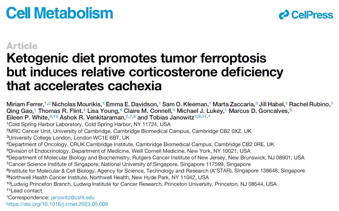 2023年6月12日,冷泉港实验室的研究人员在 Cell Metabolism 期刊发表了题为:Ketogenic diet promotes tumor ferroptosis but induces relative corticosterone deficiency that accelerates cachexia 的研究论文。