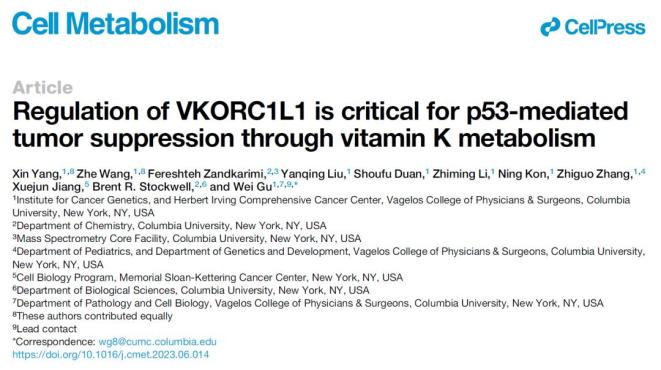 2023年7月18日,哥伦比亚大学顾伟教授团队(杨鑫博士和王哲博士为第一作者)在 Cell Metabolism 期刊发表了题为:Regulation of VKORC1L1 is critical for p53-mediated tumor suppression through vitamin K metabolism 的研究论文。