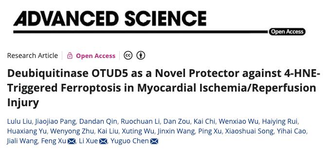 2023年8月8日,山东大学齐鲁医院陈玉国团队等在 Advanced Science 期刊发表了题为:Deubiquitinase OTUD5 as a novel protector against 4-HNE-triggered ferroptosis in myocardial ischemia/reperfusion injury 的研究论文。