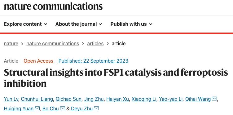 2023年9月22日,山东大学基础医学院初波教授团队联合苑辉卿团队,在 Nature Communications 期刊发表了题为:Structural insights into FSP1 catalysis and ferroptosis inhibition 的研究论文。
