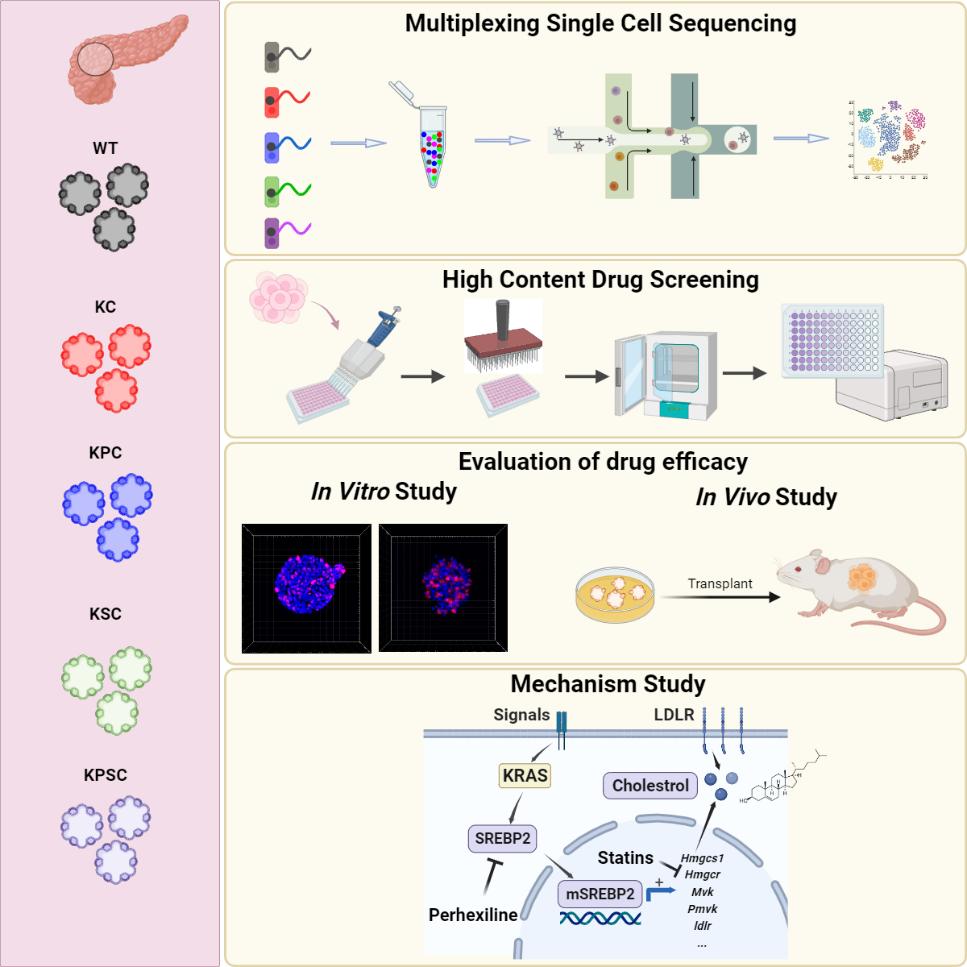 肿瘤类器官已成为临床前与癌症转化研究的强大工具。FDA 也批准使用类器官模型来代替体内小鼠模型,这进一步强调了类器官在未来对药物研发的重要性。2023年12月26日,来自美国康奈尔医学院的陈水冰团队在Cell Stem Cell 杂志上发表题为 A Pancreatic Cancer Organoid Platform Identifies an Inhibitor Specific to Mutant KRAS的文章。他们开发了一组等基因小鼠胰腺类器官平台,其中包含常见的 PDAC 驱动突变 KRASG12D、Tp53R172H 和 SMAD4 缺失。基于这一胰腺类器官筛选了约 6000 种化合物,并鉴定出了 Perhexiline maleate,它可在体外和体内特异性抑制携带 KRASG12D 突变的 PDAC 类器官的生长。进一步研究表明Perhexiline maleate 通过下调 SREBP2 的表达来抑制胆固醇代谢途径,从而逆转KRAS突变诱导的PDAC 类器官的代谢重编程。该研究为筛选靶向胰腺癌的抑制剂提供了强有力的研究工具,同时鉴定了SREBP2是胰腺癌治疗的潜在靶点。