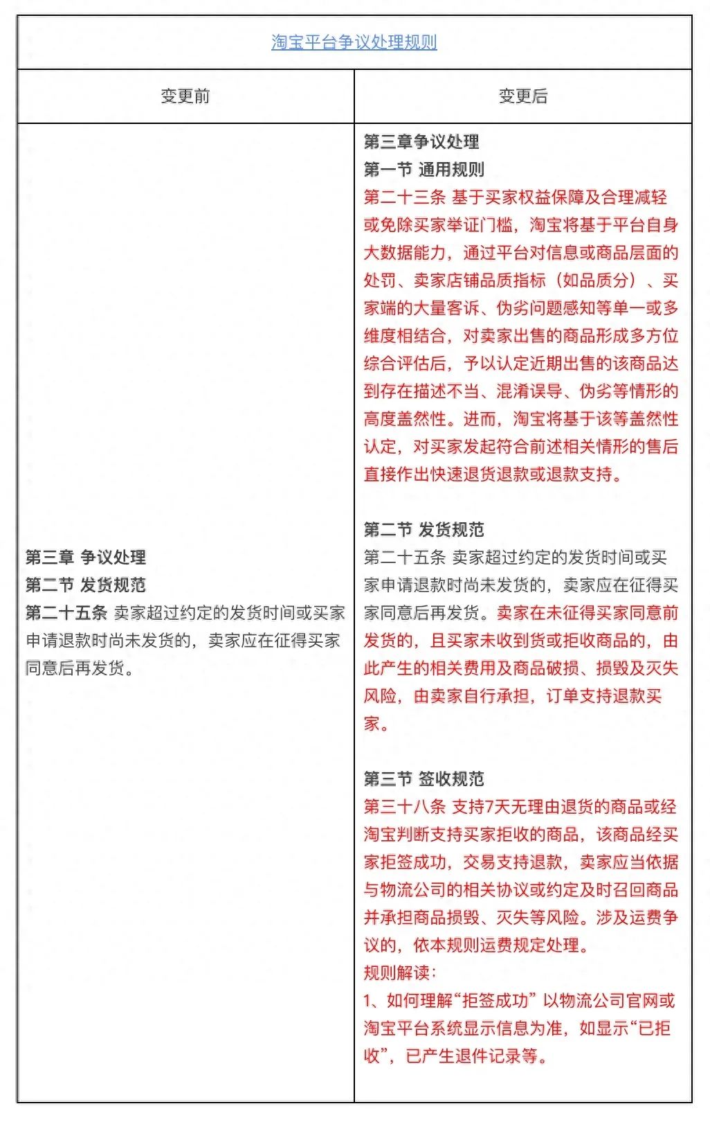 核心变更点包括:新增淘宝基于平台自身大数据能力,结合多维度识别,对于买家发起符合相关情形的售后,作出快速退款或退货退款的规则依据;针对卖家存在延迟发货、强制发货的且未经买家同意的情形,补充钱款处理方向规则依据;新增针对支持7天无理由退货或经平台判定可支持买家拒收的商品,针对买家已拒签成功的,支持退款处理的条款。