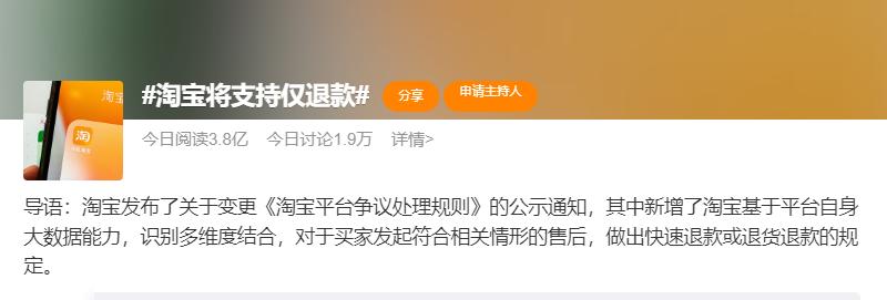 就在昨天,# 淘宝将支持仅退款 # 的话题,冲上了热搜榜第一。