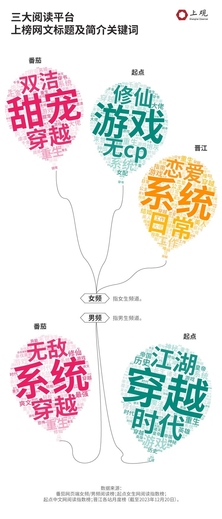 统计了番茄、起点、晋江三大网文平台的3037篇上榜网文中的标题、简介中的热词后,我们发现,番茄与起点、晋江在网文题材和内容风格上已经出现不同。