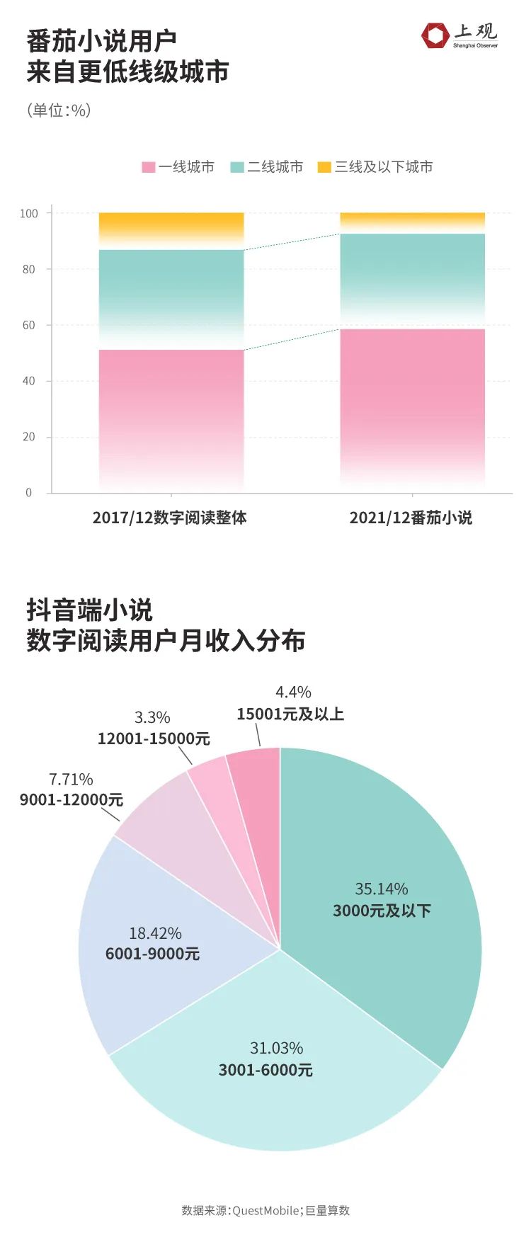 巨量算数的数据显示,2022年10月,抖音端数字小说阅读用户中,35.1%的用户月收入为3000元及以下,另有31%的用户月收入位于3001-6000元的区间。番茄与抖音同属于字节跳动,其重合用户占据番茄整体用户的72.1%,因此,抖音端数字阅读的数据,一定程度上可以反映出番茄用户的收入水平。