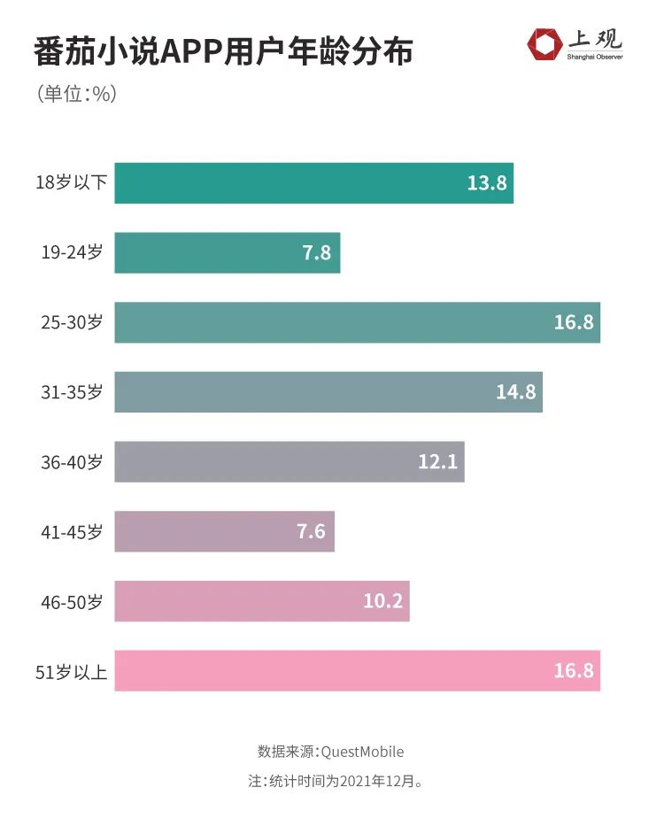 QuestMobile的数据显示,2019年,免费阅读人群多集中在25-30岁、31-35岁的年龄段,占比分别超过20%。但在免费阅读APP番茄小说上,用户更多集中到了18岁以下、51岁以上这两个年龄段。