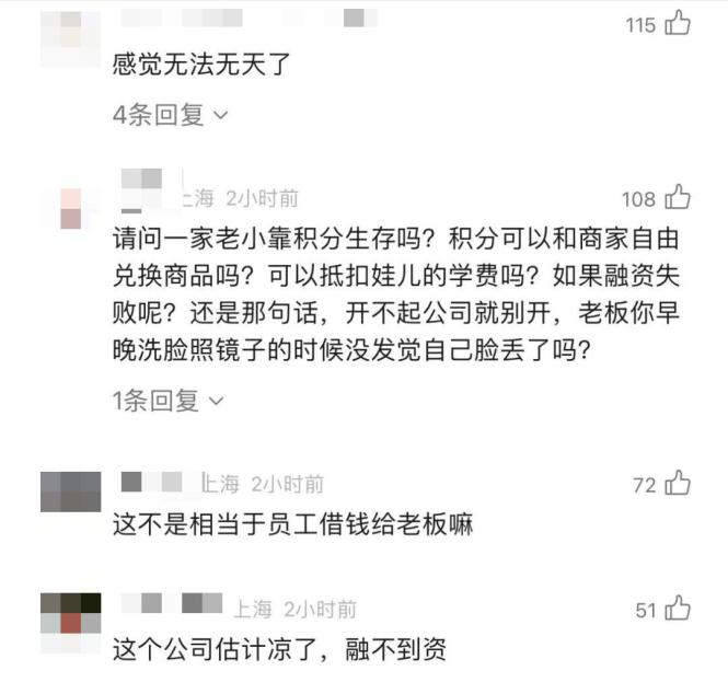 12月26日,上述公司相关负责人表示:“我们是初创公司。‘积分制度’是公司的独创。员工来公司工作的前4个月左右是发积分不发工资,公司用积分计算工作量,等到融资到位之后就补发工资。”
