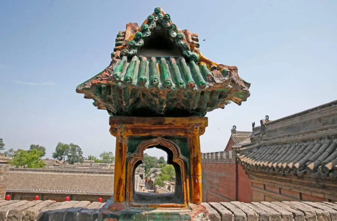 张壁古堡空望佛祠的殿顶介休琉璃规模最大、颜色造型最为丰富的,首推介休城内的后土庙道教建筑群。后土庙建筑群包括后土庙和三清观两部分,东侧有子孙娘娘殿、吕祖纯阳殿、关帝庙、土地祠以及罕有的三连戏台,是全国罕见的庙观联体建筑。其始建于北魏年间,宋、元、明均有重建,现存的琉璃构件多为清嘉庆、道光年间的作品。后土庙殿阁顶部的琉璃装饰高大雄伟、色泽艳丽,脊瓴上的牡丹图案雍容华贵、俯仰开合、各具韵致、形神兼备、造型鲜活。戏楼前八字照壁的博风板上,以黄、绿、紫色釉烧制的老鼠拖葡萄装饰,两面葡萄一为椭圆形乳白色,一为园形紫色。尤其是以圆形绿釉色为主色调的“麒麟闹八宝”影壁心图案,构思大胆而灵动,居中的麒麟占去了三分之二的画面,在其周边环绕着月亮、双圈、海螺、羚羊角、鹿茸、灵芝、双菱、元宝、钱串,以及松、鸟等寓意吉祥的图案,四个角上嵌有琴棋书画五彩斑斓,其寓意非常独特、动感飘逸、个性鲜活。