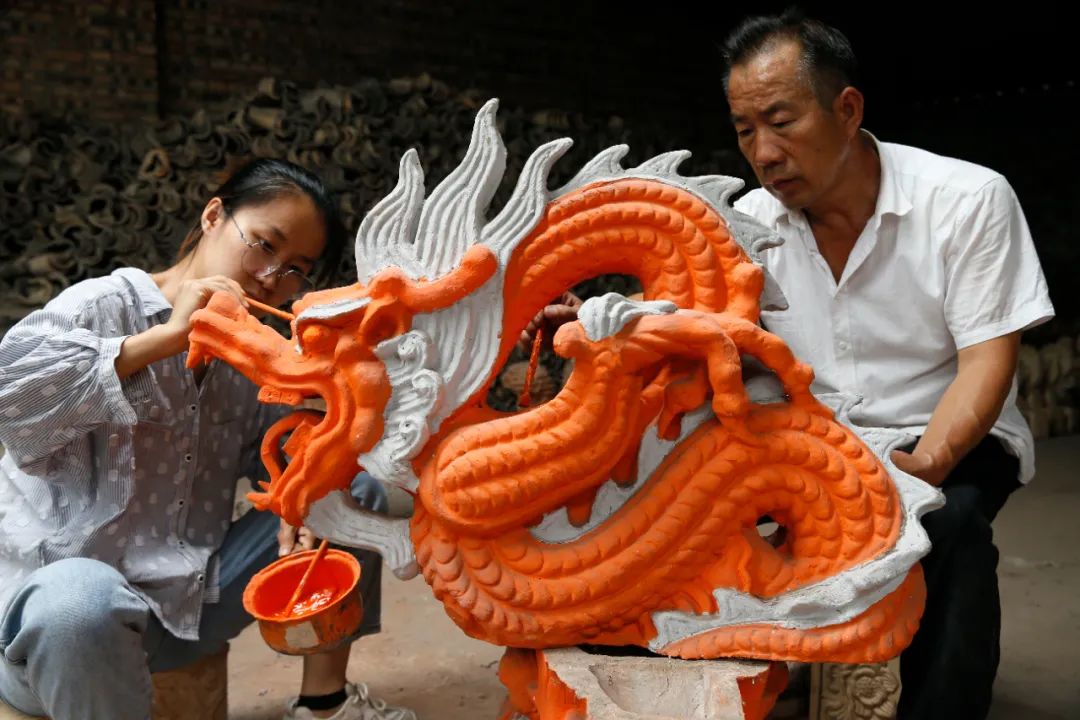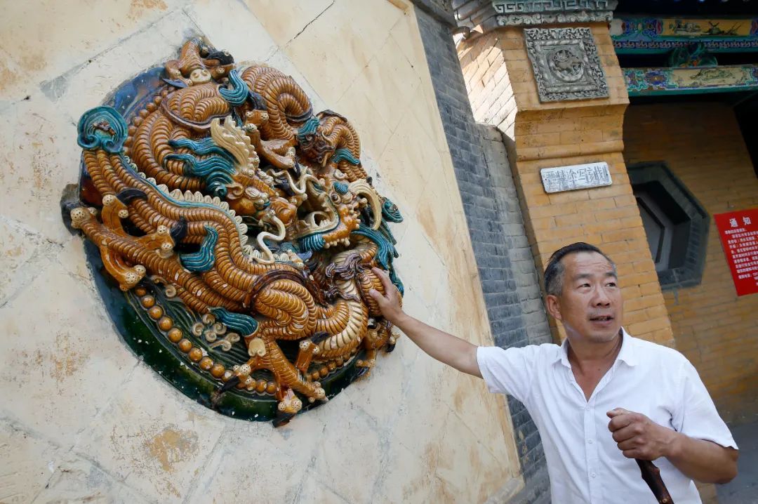 介休源神庙门口原来的琉璃二龙戏珠丢失后,刘开宝制作了一个同样尺寸的。