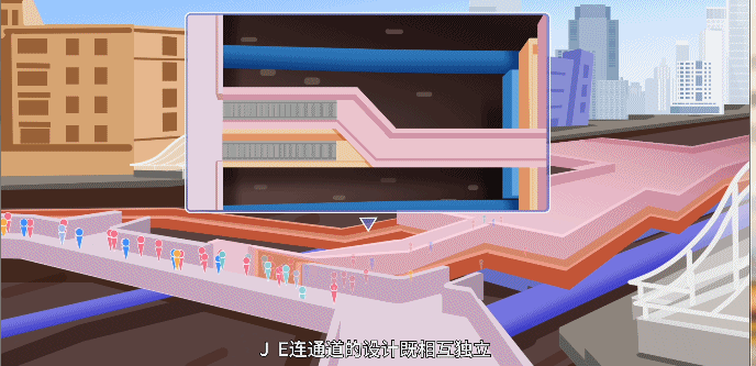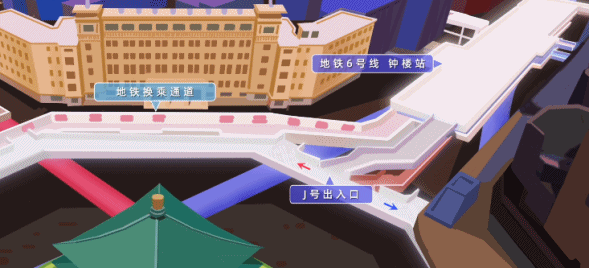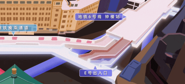 本次开通的J出入口连接钟楼地下盘道,直达东大街南北两侧,实现了市民的“直通、直达”过街体验,E出入口连接钟楼盘道直达站厅层。该设计形式在地铁出入口和钟楼盘道“贯通”过街的基础上,进一步实现了地铁乘客与市政过街客流的相互转换。J、E通道的设计既相互独立,又相互补充,巧妙地构建了一个分层分流、互不影响的城市过街及地铁进出站系统,将地铁和市政两种不同的功能载体有机地连接在一起。