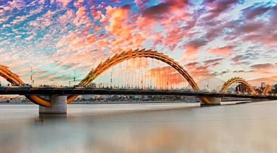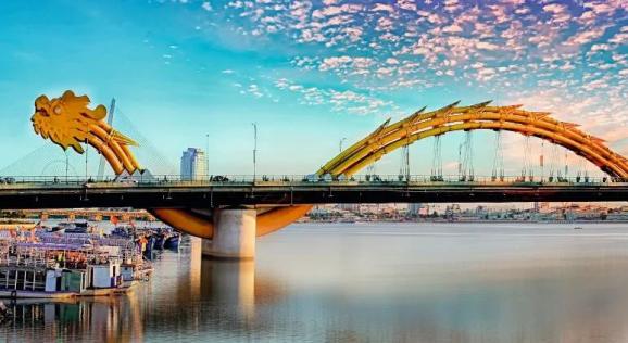 越南岘港市龙桥,跨越瀚江,全长666米,宽37.5米,为六车道公路桥,2013年竣工通车。桥上吊柱被装饰成龙形,整齐排列着尖锐龙鳍,风格独特的龙头里还设置了可以喷出烟火的装置。这座龙桥已然成为岘港城市象征与重要观光景点