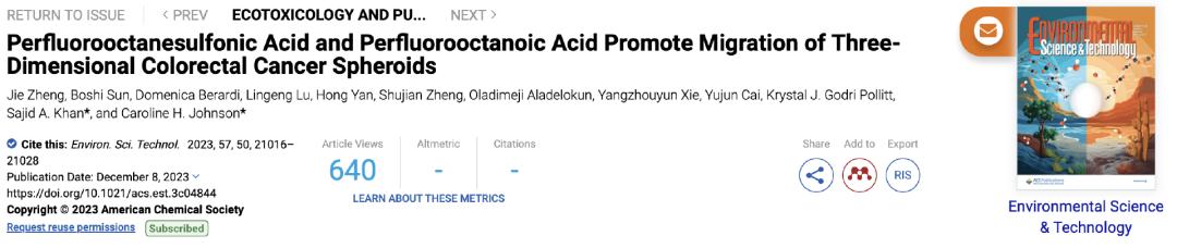 [1] Zheng J, Sun B, Berardi D, Lu L, Yan H, Zheng S, Aladelokun O, Xie Y, Cai Y, Godri Pollitt KJ, Khan SA, Johnson CH. Perfluorooctanesulfonic Acid and Perfluorooctanoic Acid Promote Migration of Three-Dimensional Colorectal Cancer Spheroids. Environ Sci Technol. 2023 Dec 19;57(50):21016-21028. doi: 10.1021/acs.est.3c04844. Epub 2023 Dec 8. PMID: 38064429.