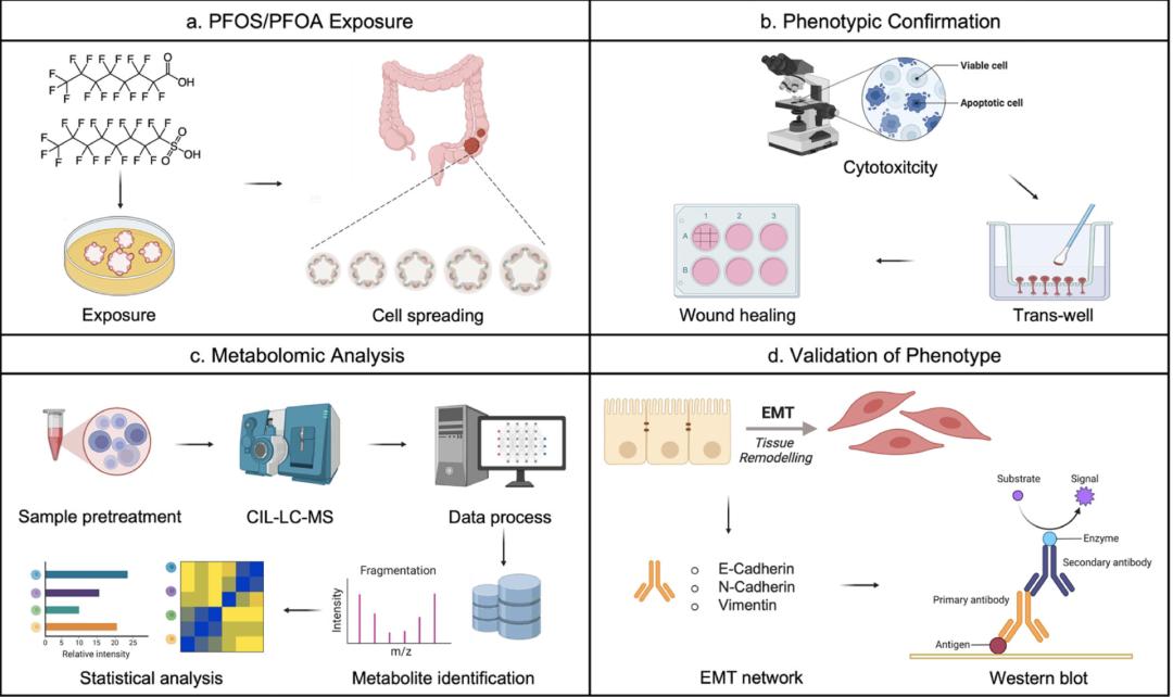 近日,来自美国耶鲁大学的研究团队发现了PFAS的新“毒证”——采用一系列生物学技术和代谢分析方法,在体外实验中全面地探究了PFOS和PFOA对结直肠癌发生发展的影响。结果显示,暴露于PFOS和PFOA之后,结直肠癌细胞的活力以及转移能力明显增加,这意味着接触PFAS之后的癌细胞可能更易扩散,从而促进肿瘤转移。