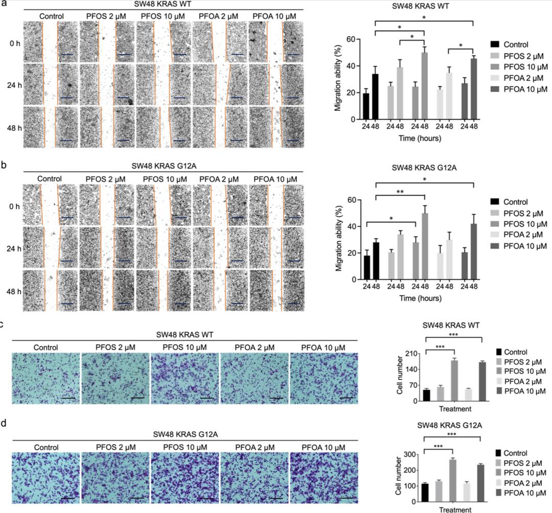 研究过程进一步的“迁移能力”评估测试显示,暴露于2μM水平时,24小时后,SW48 KRAS WT细胞的迁移能力从20%升高至25%(PFOS)或23%(PFOA);48小时后,迁移能力从34%升高至39%或35%。但没有统计学意义。不过,暴露于10μM水平的PFOS和PFOA的48小时后,SW48 KRAS WT细胞的迁移能力显著升高,分别从34%升高至50%和46%。