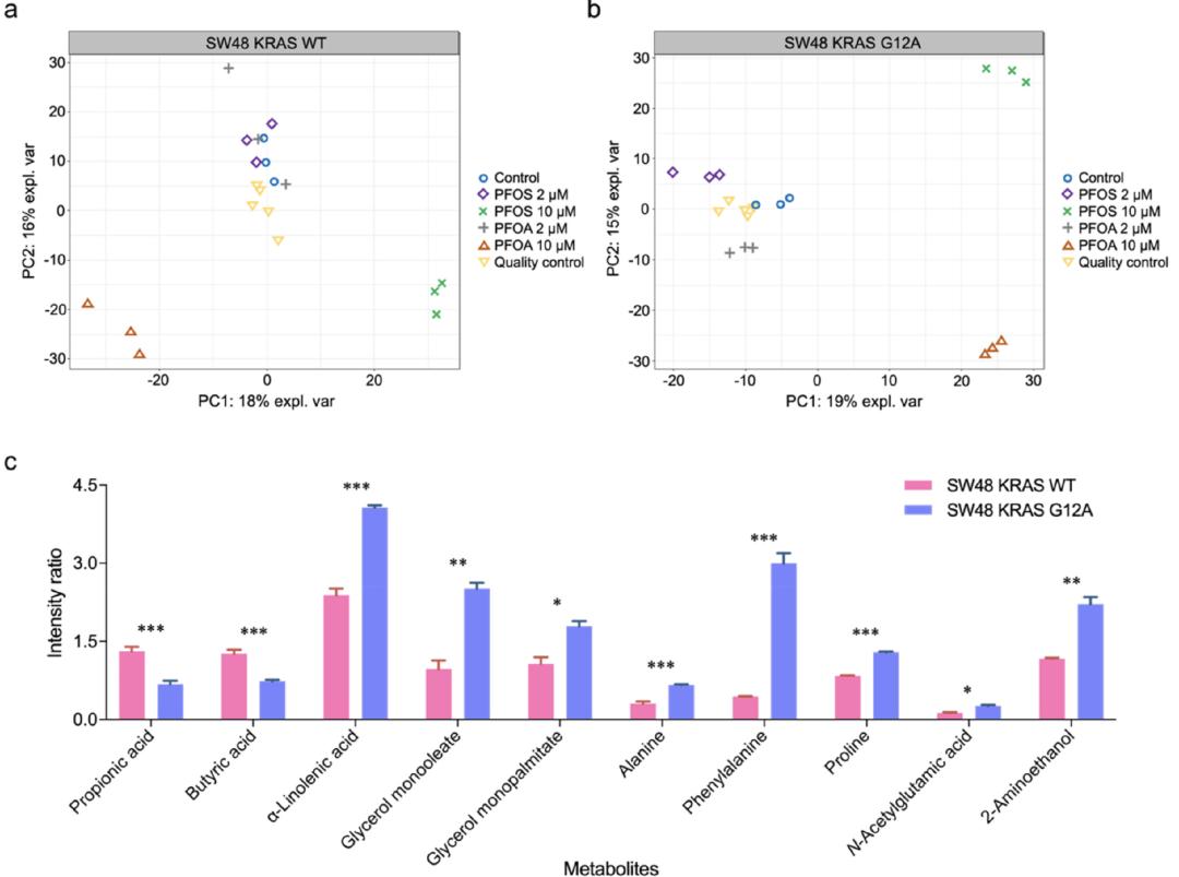 具体来说,暴露于10μM的PFOS或PFOA后,与对照组相比,SW48 KRAS WT细胞组和SW48 KRAS G12A细胞组分别有23个和22个代谢物发生了改变,且差异集中在脂肪酸和氨基酸等代谢物上。