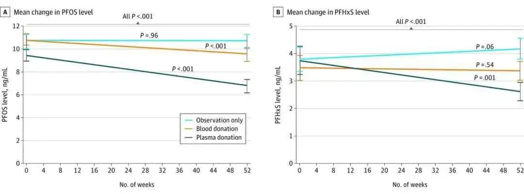 先前,JAMA子刊上的研究收集了285名血液中PFAS水平含量较高的消防队员,测量后发现,相较于不献血者,献血可以使参与者平均血清 PFAS 浓度降低大约30%,并且这一差异在试验结束三个月后保持不变,具有较好的持续性。