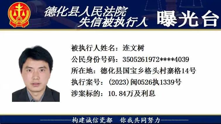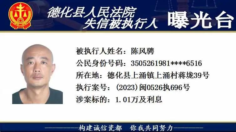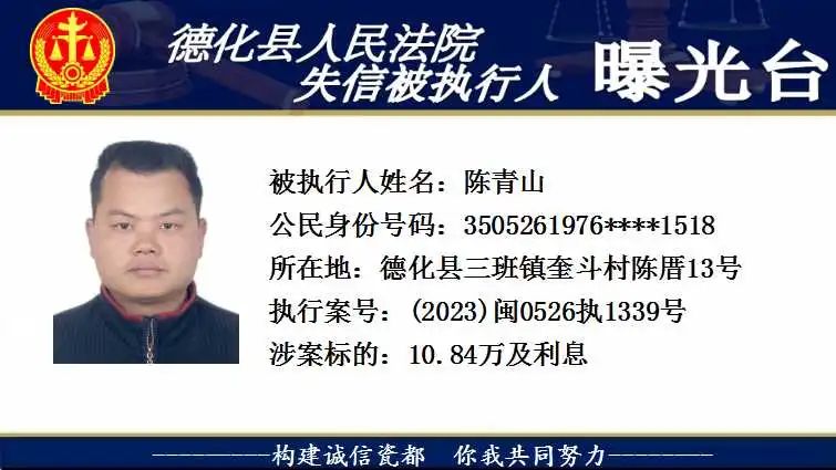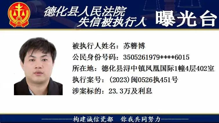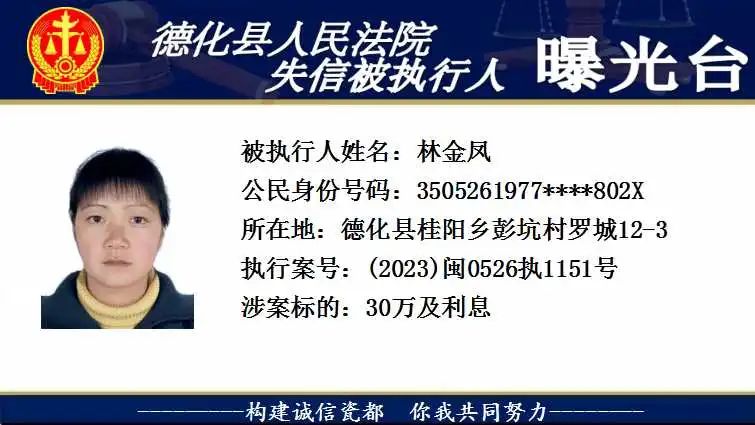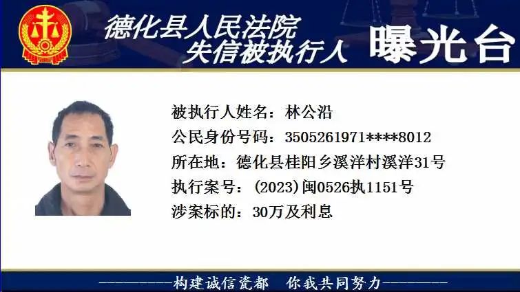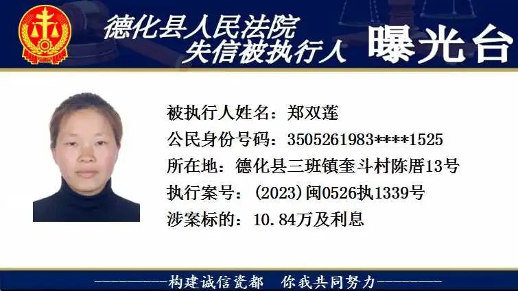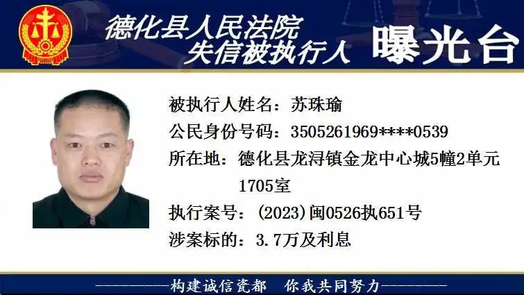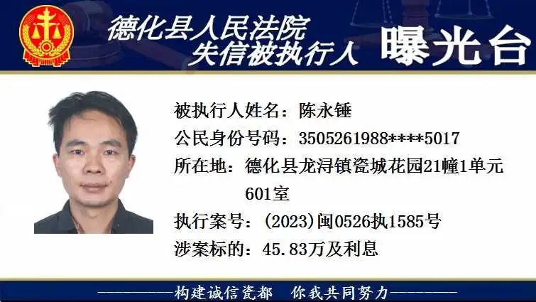 为维护法律的尊严和权威,弘扬社会诚信风气,根据相关法律规定,现将以下失信被执行人予以曝光。对有财产拒不履行已经发生法律效力的判决、裁定的,本院将依法予以司法拘留,构成犯罪的,将依法移送公安机关立案侦查追究刑事责任。欢迎广大群众举报失信被执行人财产线索,举报方式:德化县人民法院执行局(0595-23522341)