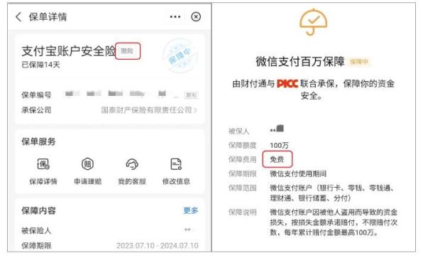当用户注册使用微信支付、支付宝时,将自动免费开启“百万保障”,此保障为APP自带安全设置,完全免费,不会“到期”或者“过期”,不会要求“缴费续保”,更不会影响征信。