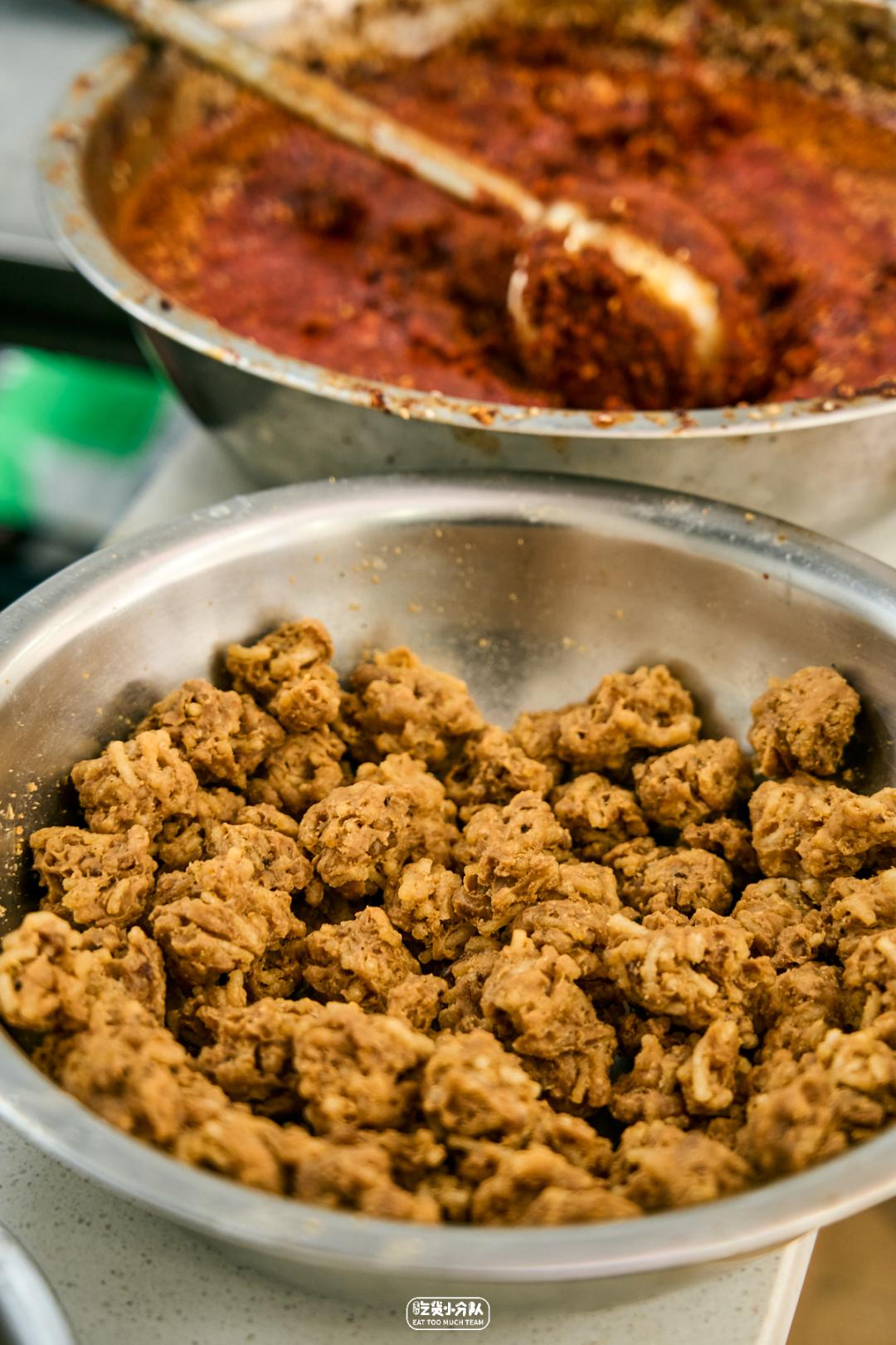 焦炸丸子是洛阳限定款,出了洛阳做法就不一样了,直接加在汤里,单独做成丸子汤还是洛阳水席名菜。红薯粉条加少量鸡蛋面粉,炸出来里外都金黄焦脆,直接吃像嘎嘣作响的小零食,所以又叫嘎嘣脆。泡进汤后要考验手速,半酥半软的状态最得劲,吸饱香辣汤汁,还带着清脆声响。03