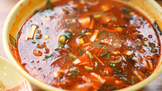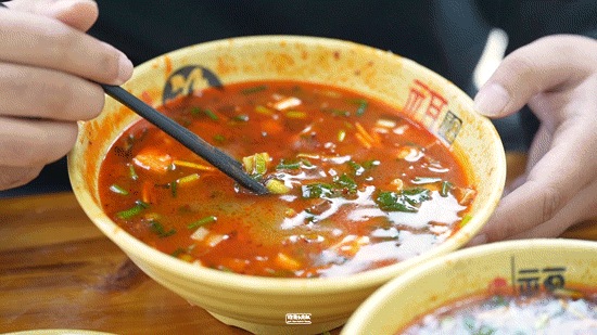 洛阳喝汤有一怪:不用勺。“布捉碗”(抱着碗)就行了,用筷捞稠的,大片牛肉酥软中带着嚼劲。溜着碗边喝稀的,大口热汤入喉,清早的严寒都被驱散殆尽了。要是碰见有人“谷堆着”(蹲)在路边喝汤,铁定是老洛阳人无疑了。