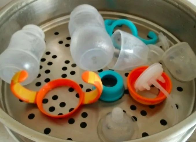 2. 蒸汽消毒将奶瓶、奶嘴、盖子等打开,置于锅中,隔水蒸煮10分钟左右即可。