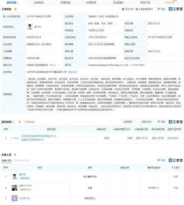 企查查显示,与辉同行(北京)科技有限公司于2023年12月22日成立,注册资本1000万元,董宇辉为法定代表人、执行董事、经理,新东方教育科技集团有限公司主席俞敏洪担任监事,最终受益股份为99%。公司经营范围包括互联网信息服务、日用品批发,以及鲜肉、新鲜水果等多类产品零售,此外还包括演出经纪、营业性演出、旅游业务等。