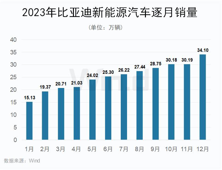 1月2日,比亚迪公布了最新销量数据,2023年12月新能源汽车销量34.1万辆,同比增长45%;2023年累计销量302.44万辆,同比增长62.3%。