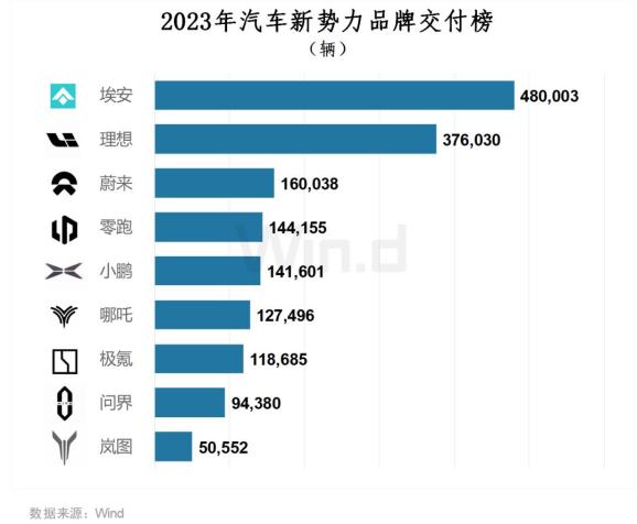 具体来看,除了新能源“巨头”比亚迪外;广汽集团旗下新能源品牌埃安实现年销48万辆;理想汽车月销破5万辆,以年销37.6万辆的成绩领跑造车新势力。而蔚来、零跑、极氪、AITO问界、小鹏等车企也实现了不错的市场表现。