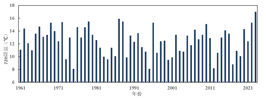 1961-2023年上海市区(徐家汇站)日平均气温72小时最大降幅